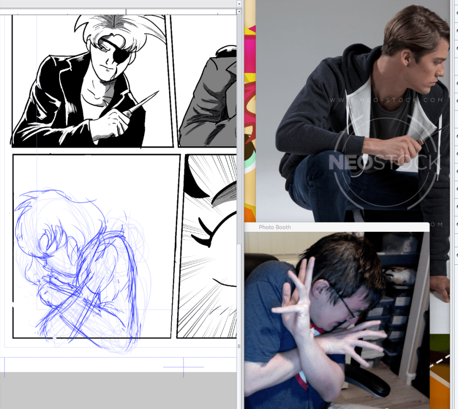 So just this weekend I received a critique about my art, and of course with everything I do, I’m always striving to improve my craft. So I’ve started practicing with reference and even incorporating it into the latest pages. Don’t mind the little selfie down below, I do often time photograph myself with the photo booth on the computer when I’m short on reference for a particular pose idea.