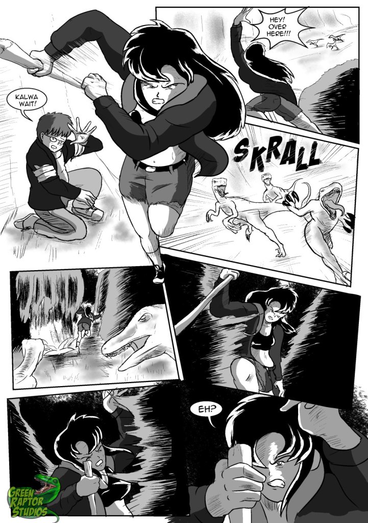 Many of the jokes and plot threads all stem from some personal thoughts and personal affections on dinosaur stories and history. While most stories feature a powerful carnivore such as a T-Rex as the main dinosaur antagonist, I wished to give the antagonist role to my own personal favorite dinosaur the Velociraptor, which would make up for the lack of size with numbers, constantly putting Kalwa in jeopardy with relentless pursuit and forcing her to fight off the raptors one by one. In order to keep the pages within limit, and make it possible for Kalwa to fight off the raptors by herself, the raptors were made notably more vulnerable in that a simple blow could put one down, a fact that I discovered was correct long after the chapter was complete.