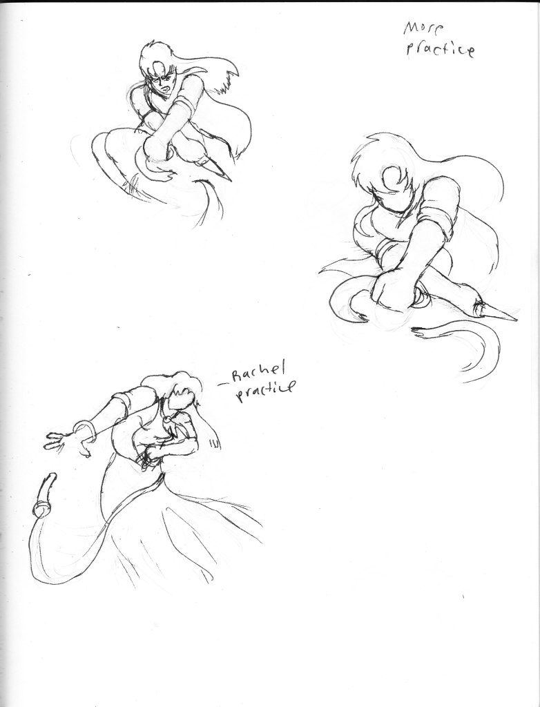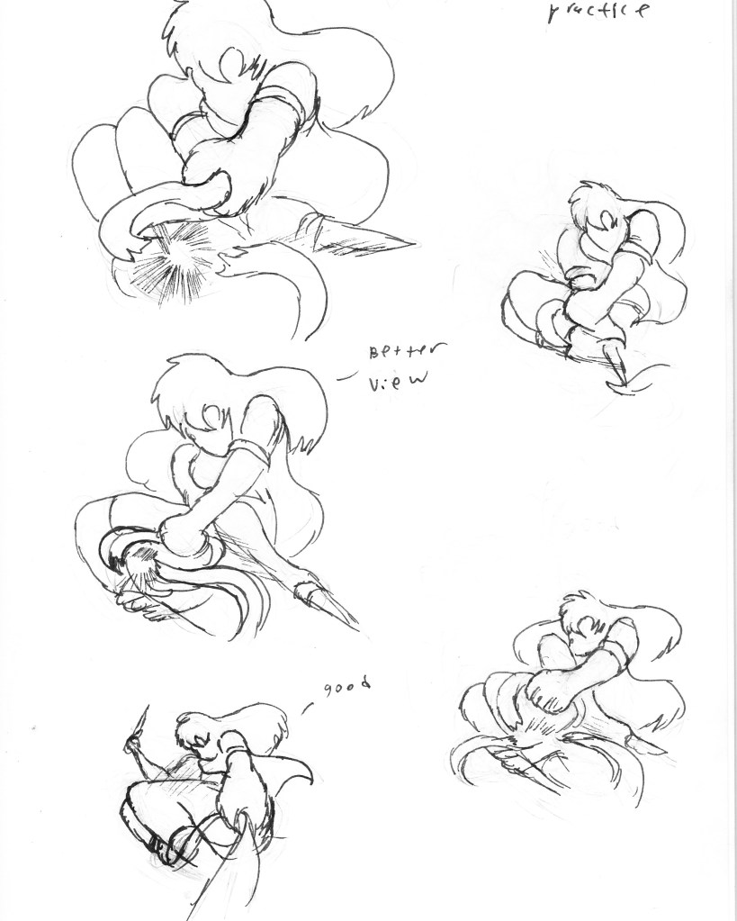 These were a few old pages I dug up in my sketchbook which were actually practices for actual comic pages! Back in the early days when I would get stuck on a pose or a camera angle shot, I’d usually practice in the sketchbook to draw the image I was imagining. This particular shot is from chapter 8 when Kalwa’s having her vicious fight with Rachel, as she cuts the whip and Rachel throws it away. Now day’s I mostly just have it all figured out when I’m doing layout. If I do usually get stuck on a particular shot I really just do multiple roughs and re-draws on the actual panel until I get it right. The upcoming page which I previewed yesterday is an example, I got a little stuck on the back show of Kalwa throwing her phone down, so that particular pose took a good while to make. I also tend to use my action figures to help make poses, though even they have limits. A good chunk of the time I’m simply using imagination and knowledge of human anatomy to do my work.