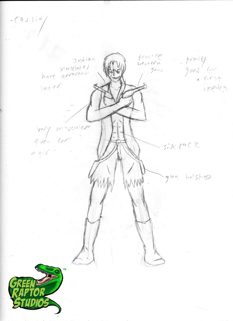 This was the first sketch of Cassidy from the Desert Vixens. Her design was initially based on Revy from Black Lagoon, and since she was meant to be the toughest of all the girls, I really couldn’t help but draw her with six pack abs. In this image she isn’t wearing a bra, that was added in the next sketch. Since Cassidy hails from an indian tribe, which wore only selected clothing, she’s actually not shy about nudity, indicated in chapter 9 when she loses her vest and still fights on. Originally she wasn’t meant to wear a bra and her vest would have covered her privates, but I felt in time this would get to hard to do constantly. So she wound up getting a bra in the end.