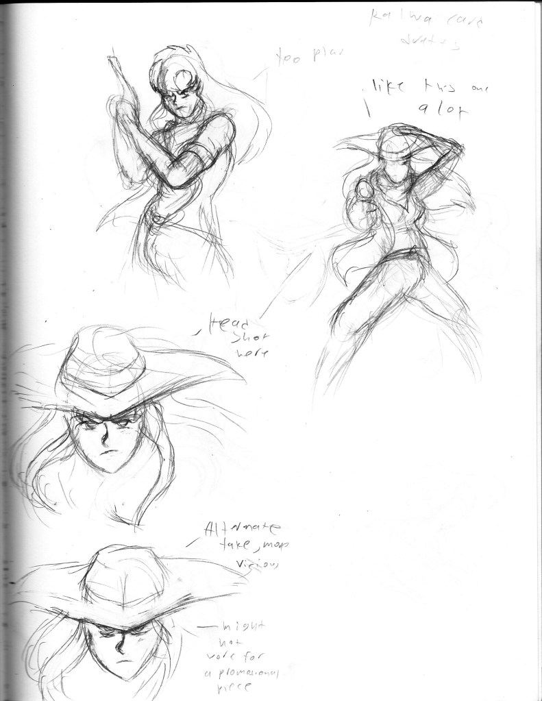 A few new sketches from sketchbook, these were a few practices/ drafts for Kalwa. The first one was just some sketching done during the Western Arch. Shortly after getting into that arch my co-writer and I attended our first convention, and shortly after that another one. So the sketches you see here are actually drafts of a card that we handed out at the second con which had a QR code that would link people directly to website. I think the real challenge with this particular one was getting the hat to look dynamic and cool.