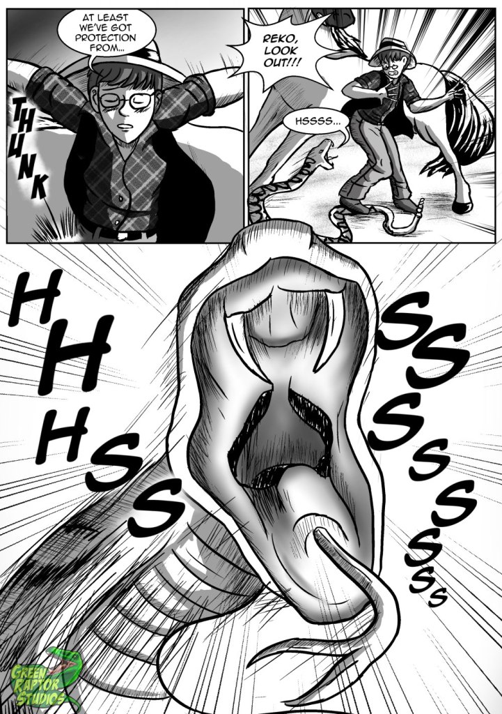 You know the old saying never step on a snake? Well here’s an answer as to why. This page was somehow a real treat to draw mainly because of the final panel where the snake lunges. I actually did have a reference image of a snake on my computer with its mouth opened up and was basically copying right from it. Somehow I feel it came out looking perfect and I’m really not an expert at drawing animals!