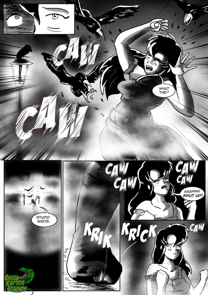 One of the build up pages to from chapter 16 which forbids the Ripper’s debut. As a big fan of horror movies part of my plan for the this chapter was to set up a tense set up for an ultimate pay off. A lot of the night pages from this chapter were influence by the IDW mini series The Fly: Outbreak, a series in which the story is general very simple, but it gets it’s power from the it’s hyper realistic yet shrouded in shadow artwork which creates a general terrifying page turner (the best way to experience this is to actually read it.). This was also one of the first pages to play with panel by panel wording and branching, note the lower panel which directly connects the sound effect from the left panel. This is actually a practice I’ve attempted to build on with future pages. I feel more modern webcomics only focus on a panel by panel basis focusing only on individual panels to deliver the story. However with my craft, I attempt to make the whole page feel important, that these panels are interlocked for a reason and that one must involve the whole page to get the over scene of the story.