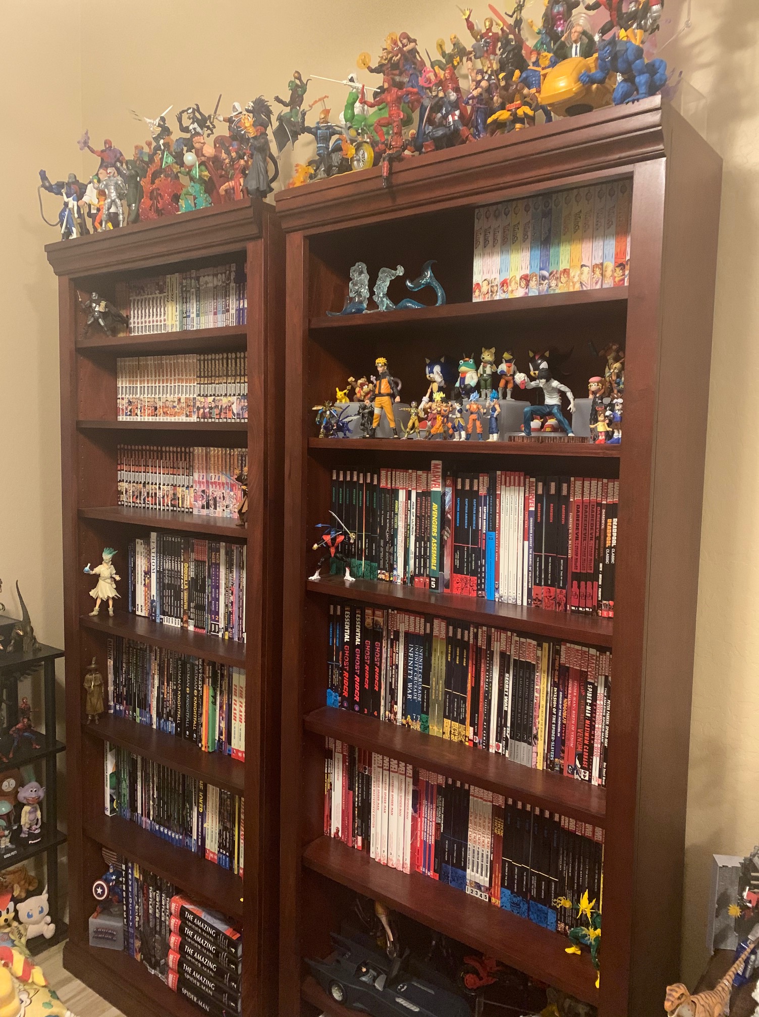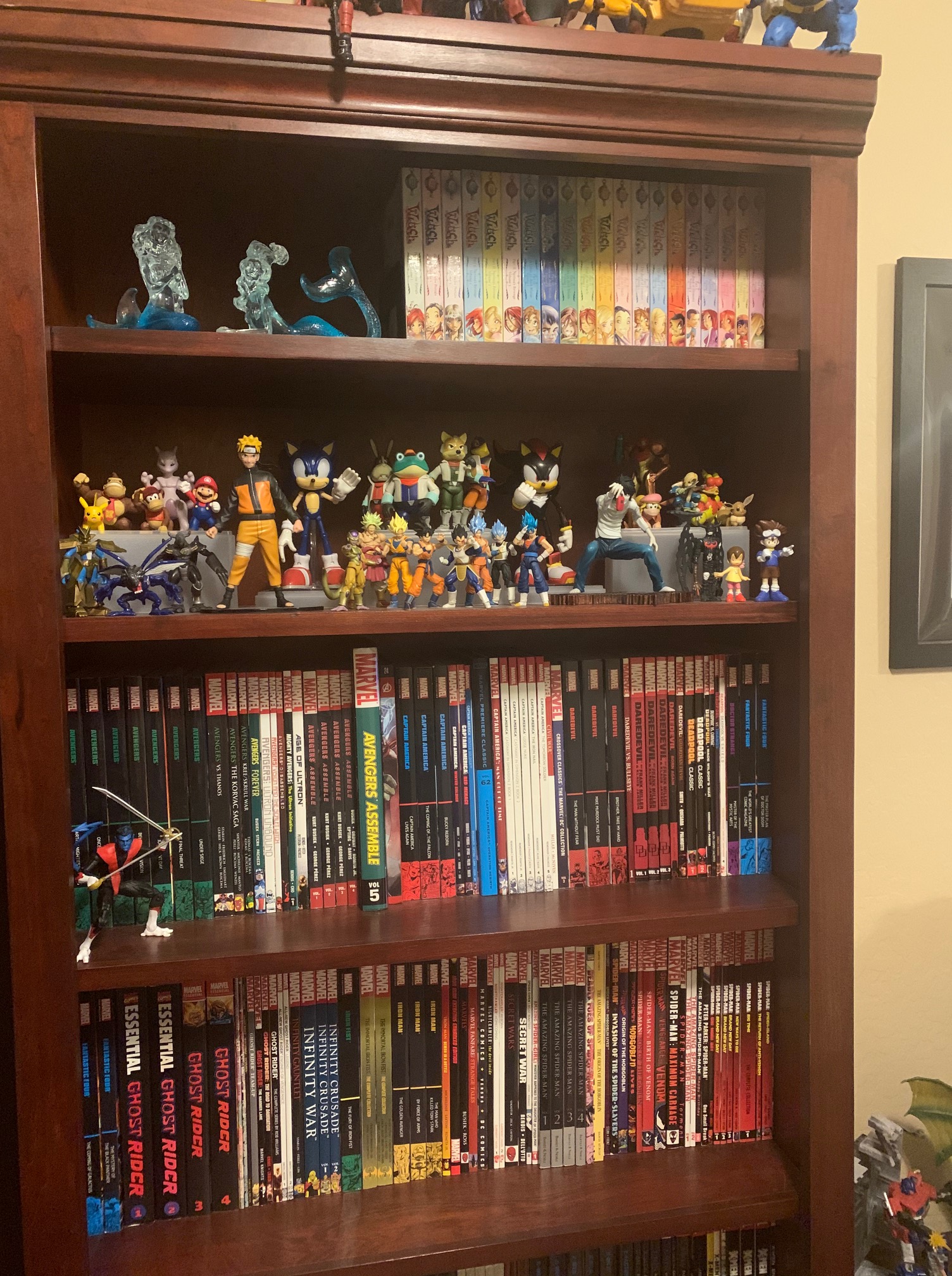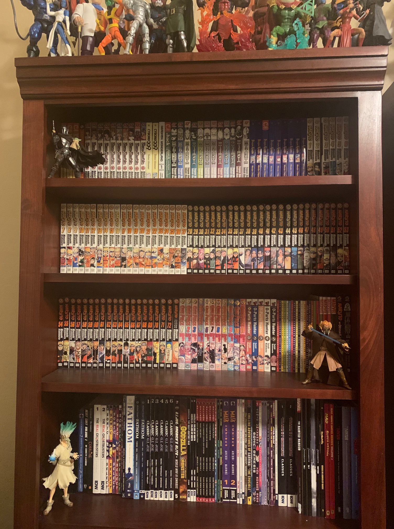So those who know me and read Kalwa and Amber should probably know that my art style is very heavily manga related, so you might be thinking that I have a large collection of manga in my library. Well actually, I don’t really have that large of a manga collection to be honest. It’s not that I dislike reading it, it simply that most manga spans a lengthy number of volumes which take up a great deal of space and it’s quite the weakness for a completionist like myself. So I just don’t like starting manga series if I feel there’s not enough room to finish. Nonetheless I do have quite a couple of manga books, it partially consists of rag tag series such as Anima +, early One Piece, and a few more titles. The only three series I have ever completed are Death Note, Buso Renkin and my crowning achievement Naruto, which stars my favorite manga hero and one of my favorite fictional characters Naruto Uzumaki. I still haven’t finished reading the whole series though I do know how it ultimately ends, I’m just saving the details for when I get there. Collecting the series literally took ten years, mostly off and on again. About two years ago I decided to just rush the rest and did about a six month binge buy on the series. Also sharing the manga shelf are a couple of small Marvel books as well as some Archie Sonic collections. The latter of which were picked up this year. I only have a few select volumes that would fit, and they only go up to a certain point, and since Archie Sonic is now cancelled it is unlikely there will be more books any time soon sadly.