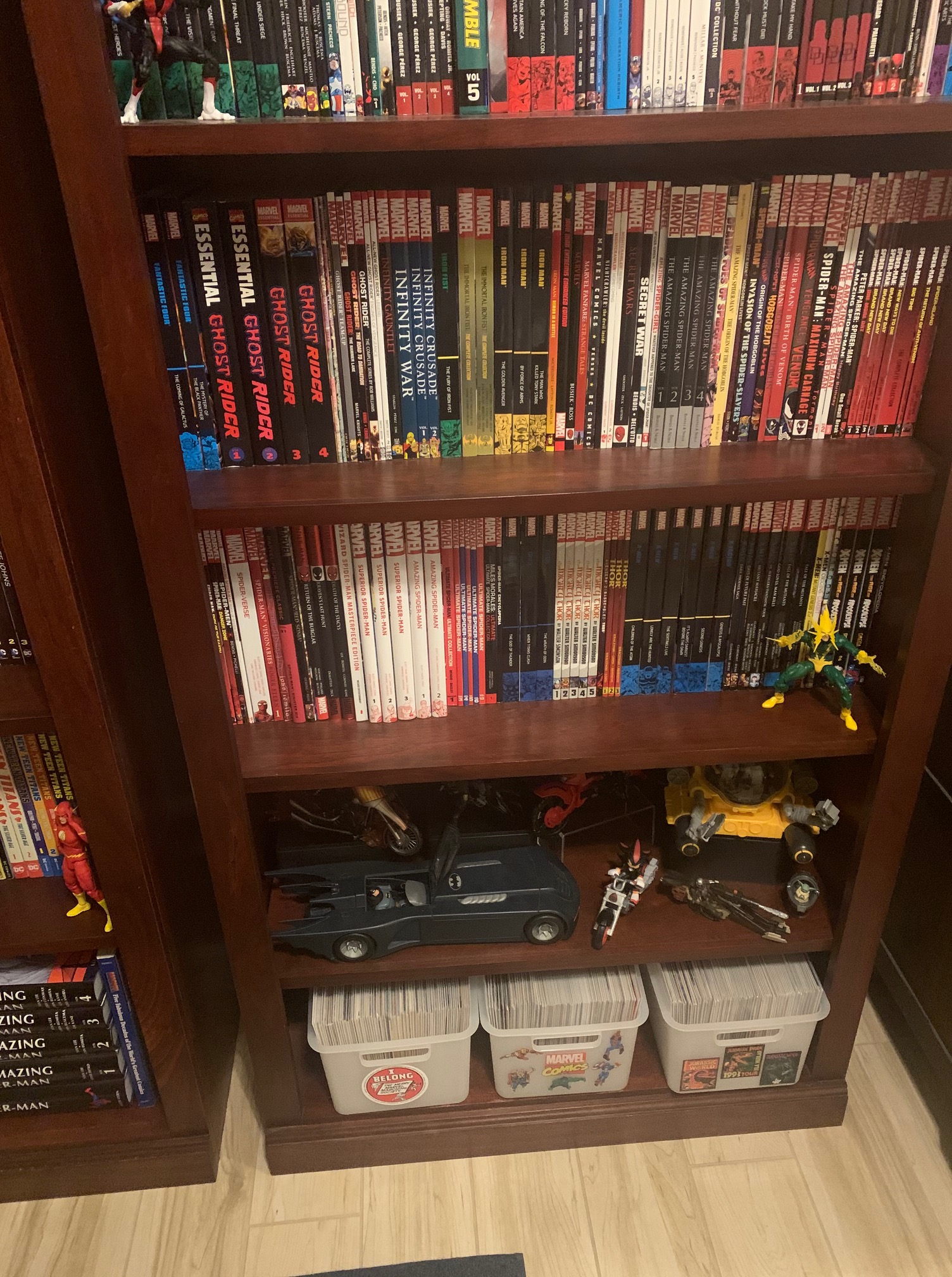Located below the Marvel shelf is a special toy display that I call “the Garage, dedicated to action figures with vehicles, and on a side note above the Marvel library is a collection of figures dedicated to anime and video games. There were actually plenty of cool vehicle toys this year that got added like the Baroness from GI Joe and the Mandalorian Mission Fleet figure with Speeder Bike. Down below the Gargage are some of the individual comics in crates, all related to Spiderman. The first bin is vintage comics from various eras such as the 60’s, 70’s, 80’s and 90’s. The second bin the Spider-Man series from 2018 which was the final run of writer Dan Slot after working on the series for nearly a decade. The third crate is Spider-Verse related comics such as Spider-Gwen and other Spider-Verse crossovers, it also has a couple of mini series staring Spider-Man supporting characters like the Prowler.