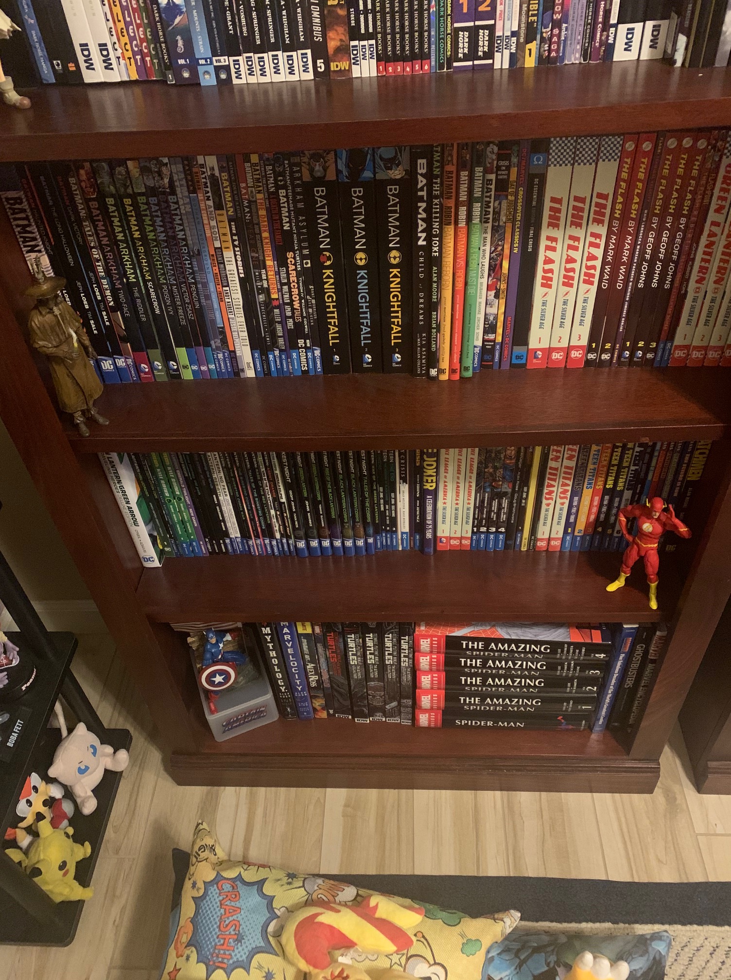 Finally we come to DC shelf, which was just completed this year. I’ve been a life long fan of Green Lantern and a large fan of Batman too. Both these characters actually held a pretty large presence in my collection even before the big move. Both of them had a large collection of books that came close to rivaling Spider-Man. Green Lantern was always my favorite of the bunch, my personal favorite Green Lantern is Kyle Rayner because I feel he’s like a fictional version of myself if I had a power ring that could convert my creative fantasies into a reality (lol). I especially love the story arcs that writer Geoff Johns wrote with his War of Light trilogy, that was my comic jam in 2011. Upon moving I finally invested in the long awaited Teen Titans series that I had always wanted but didn’t have room for at my old house. Then I decided to pick up a few Justice League books. Then after that I had enough room for one more series, and I wanted to invest in a single character not a team. The Flash had actually been a character I kinda liked by never really invested in, and I kinda thought reading about him would be kinda cool. So I started myself a Flash collection and I do love the character.