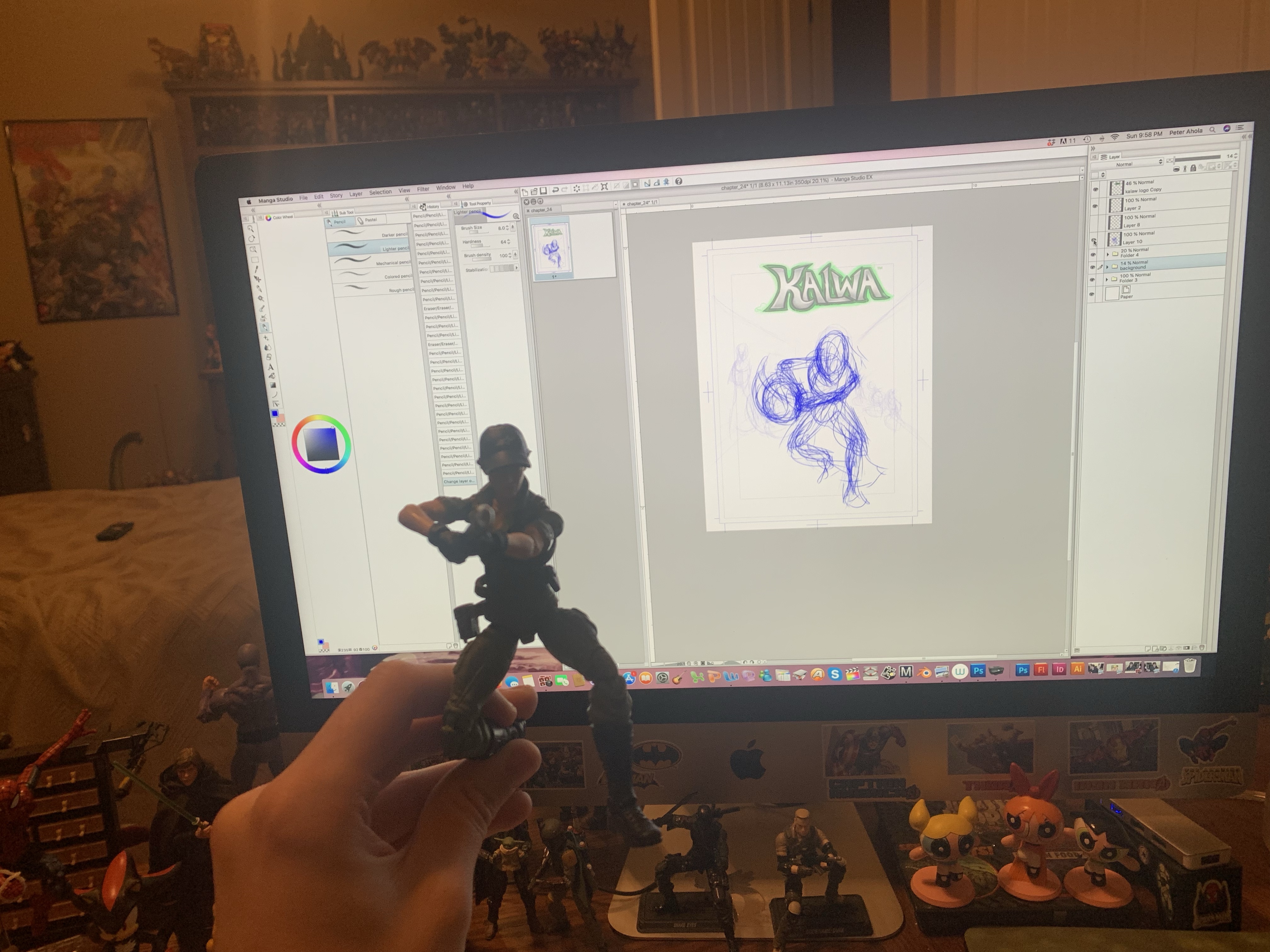 So ultimately I thought it would be better to have the weapon coming at the viewer, but of course this led to some MAJOR perspective challenges. I must’ve redrawn this image of Kalwa at least six or seven times before finally settling on the look. I was using my Classified Lady Jaye figure just to get some reference. Also at a certain point I just threw caution to the wind and just started drawing madly to try to convey the motion.