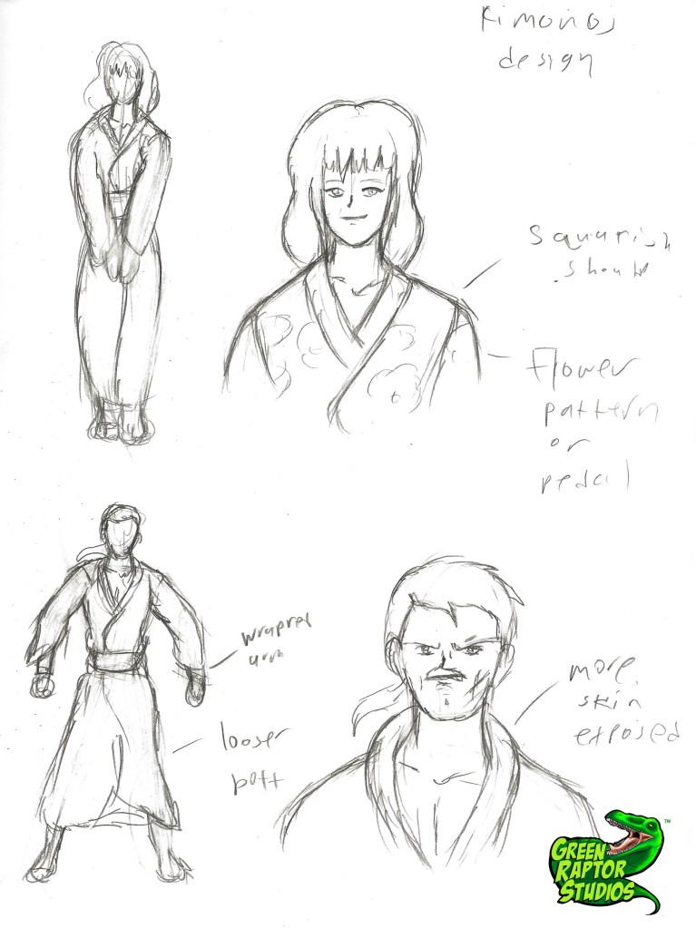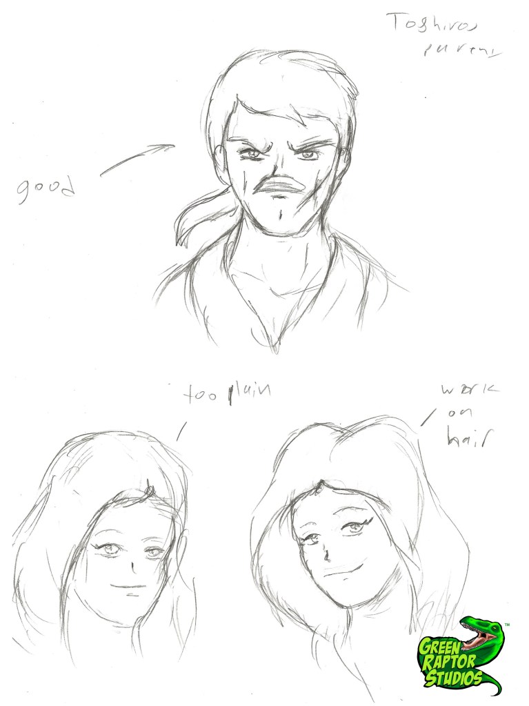 We’ll start off with Hideyoshi and Karou Sato (yes I’m saying their names in the western tongue right now). Hideyoshi’s design was kinda decided from the beginning as I wanted a simple stoic and strong looking samurai. I wanted him to have a mustache as it would suggest wisdom and nobility in addition to his strength. In fact his selected name Hideyoshi actually translates to “strong one” in Japan. Mostly when drawing him I was actually thinking of Sango’s father from Inuyasha, except with cleaner hair.