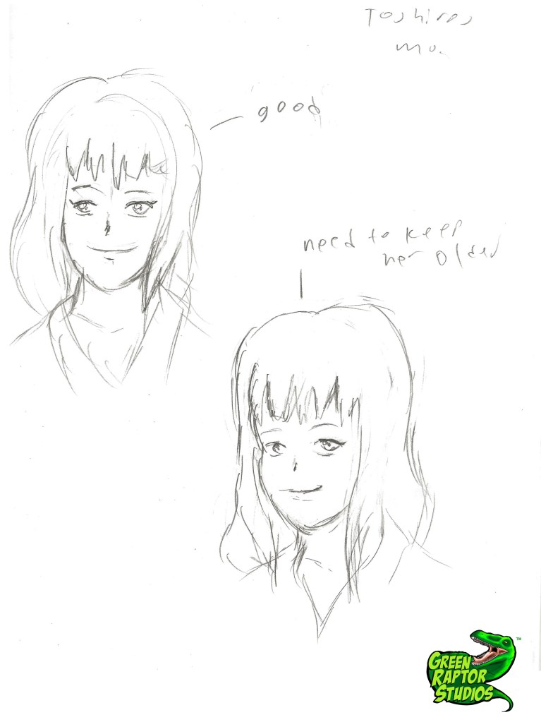 Karou’s design was a bit more tricky, as I didn’t really have a specific design in mind for her. I wanted her to look like a well mannered woman who would politely greet guests, but also wanted her to appear fun and witty as she has her own methods of survival which will be seen later in this story arch. My first drawings of her I felt looked too plain, and at the same time I felt she looked a little too old for Hideyoshi. I think I had been looking at Hinata from Naruto when designing her bangs in the final design. The real tricky thing about drawing Karou is that her long hair has to wave in and out in a certain way as it can result in her looking notably different and off model (see second sketch).