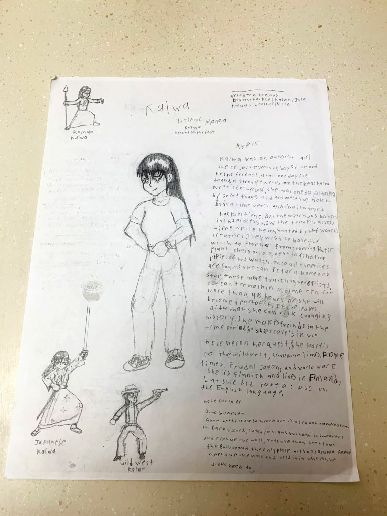 As a little backstory, the original concept for Kalwa was first created in middle school at a time I was making a lot of my own stories, more than I could probably fine tune and perfect. Kalwa was actually the fourth story I came up with, the original concept was instead of a phone, she had a time traveling watch that was damaged and flung her back in time, resulting in her having to find all the pieces in different eras in order to return home. While today, Kalwa is an eccentric adventurer with a positive outlook on life, the original version was an isolated loner whose unique interest caused others to distance from her.