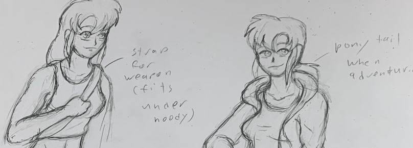 Suzume finally gets her own character art, pretty much the last major character (outside of antagonists) from the Japanese arch. Similar to Izuha, Suzume was designed to be a minor background character just to fill the student scenes, her face was drawn on the pages of other background characters in the sketchbook. But I decided to give her a little bit of a larger role as one of Kalwa’s friends. Originally she was supposed to be short tempered, but I felt this was a little cliche and done before in the story, so she’s instead a little arrogant and passionate, but still loyal to her friends.
