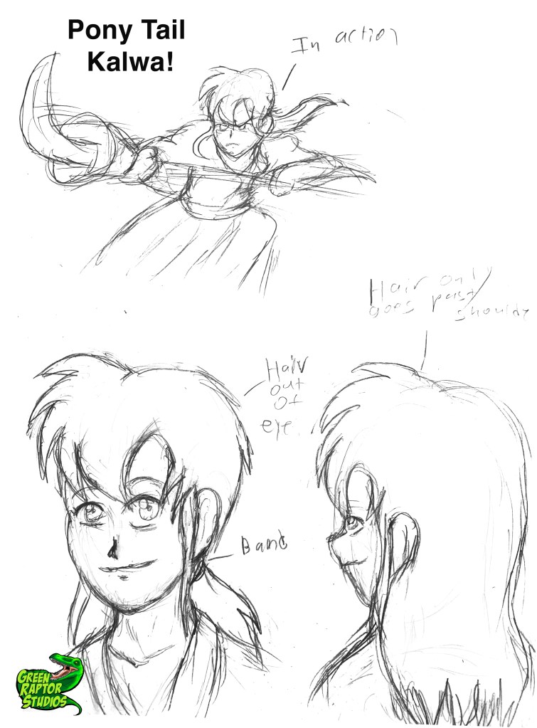 So I mentioned this on the official Kalwa facebook page, I started bringing my sketchbook to my day job, mainly for lunchtime. I have a tendency to eat my lunch super fast and then I have the remainder of an hour to sit around and do nothing. Since it’s pretty hard for me to use the sketchbook at home after a full day of working on the regular artwork, I decided to bring it and use the sit down time to work on some art. These sketches range from just plain practice (like the action scenes) to concept which is also practice for future chapters (such as the ponytail Kalwa) to some style experimentation (such as the realistic sketch below).