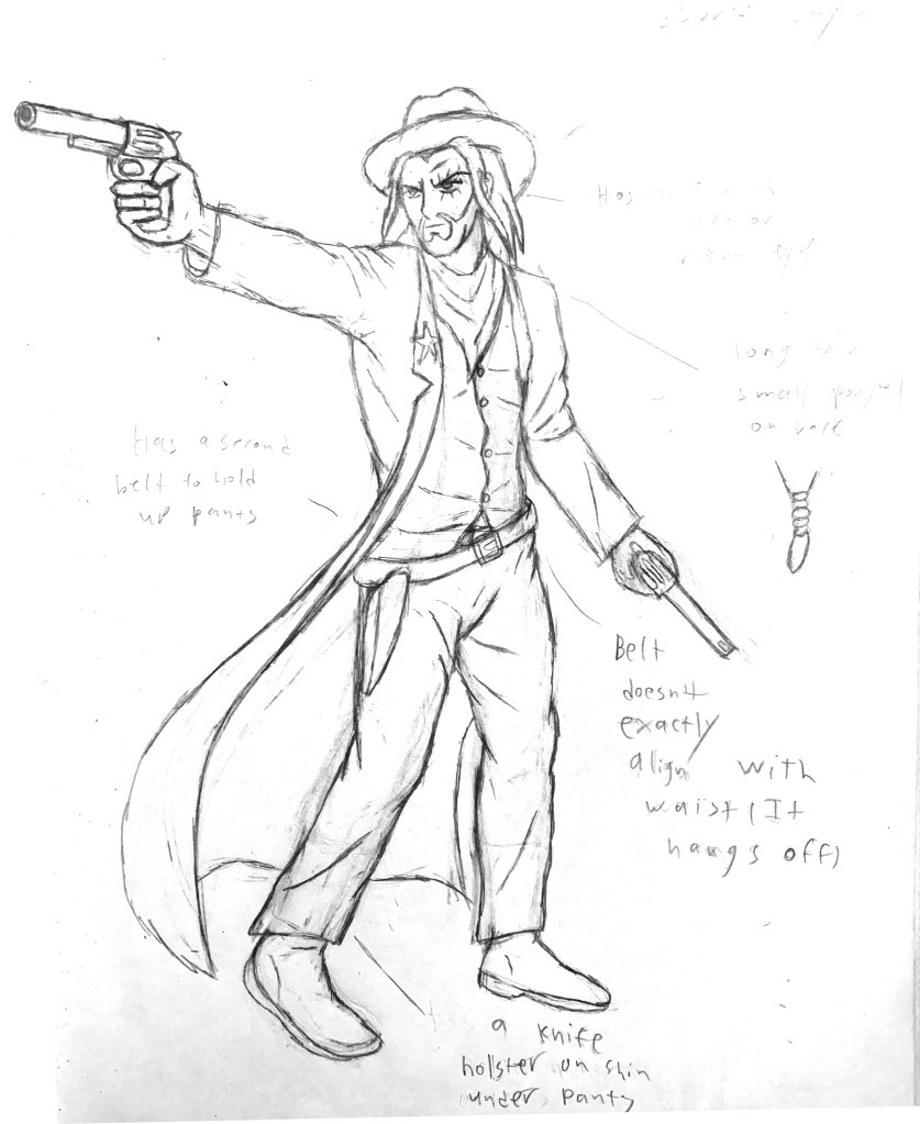Going way back to some pics that were never shared at the time. So these are the first sketches of Jacob and Waylons who debuted in the Western Arch. Waylons mostly remained the same to the final design, with the only exception being details to the coat. While I did do the drawing, it was mostly my co-writer who developed Waylons, he had a very specific idea of how he would look and even came up with his whole backstory.
